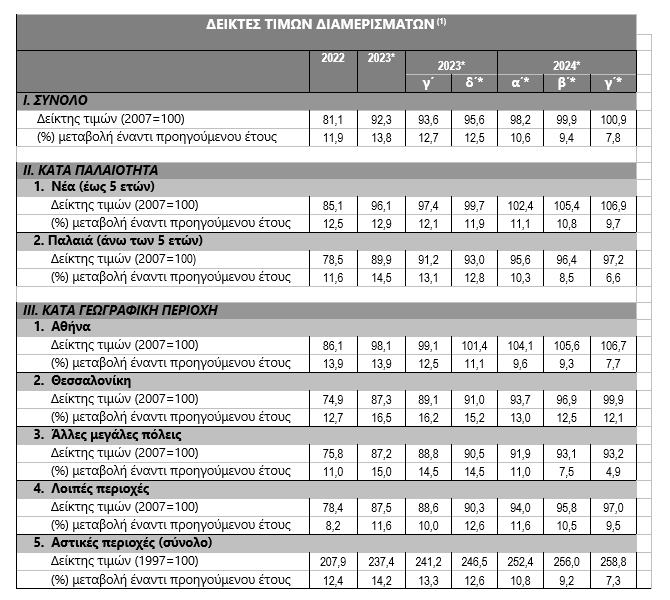 Με βάση τα διαθέσιμα προσωρινά στοιχεία της Τράπεζας της Ελλάδος, εκτιμάται ότι το γ’ τρίμηνο του 2024 οι τιμές των διαμερισμάτων (σε ονομαστικούς όρους) ήταν κατά μέσο όρο αυξημένες κατά 7,8% σε σύγκριση με το αντίστοιχο τρίμηνο του 2023. Για το 2023, οι τιμές των διαμερισμάτων αυξήθηκαν με μέσο ετήσιο ρυθμό 13,8% (αναθεωρημένα στοιχεία), έναντι αύξησης 11,9% το 2022.